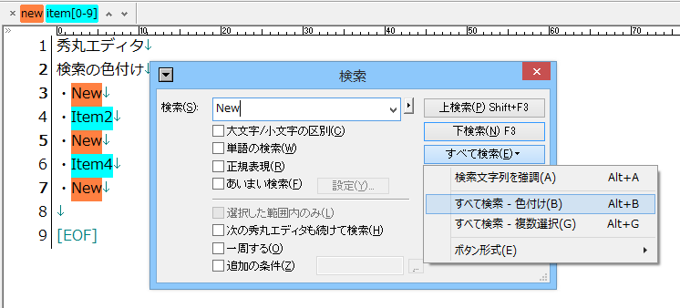 一時的なカラーマーカーのような色付けを、検索ダイアログからヒットする文字列に対して同時に行うことができます。