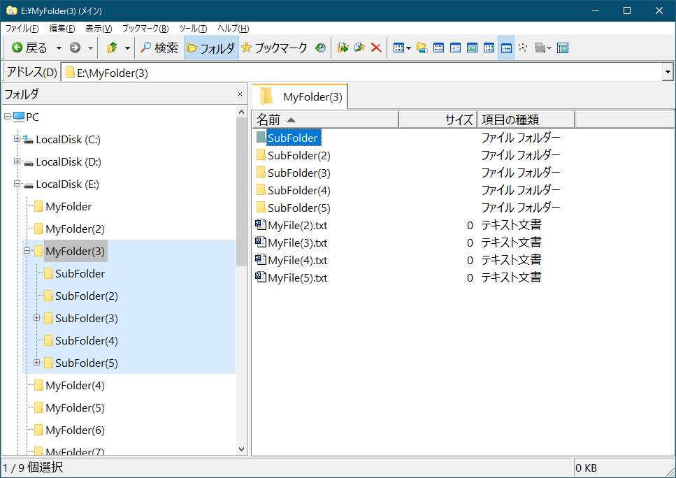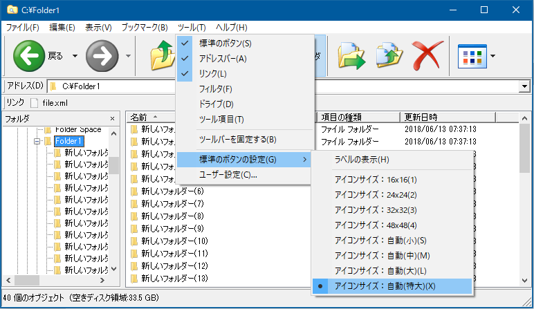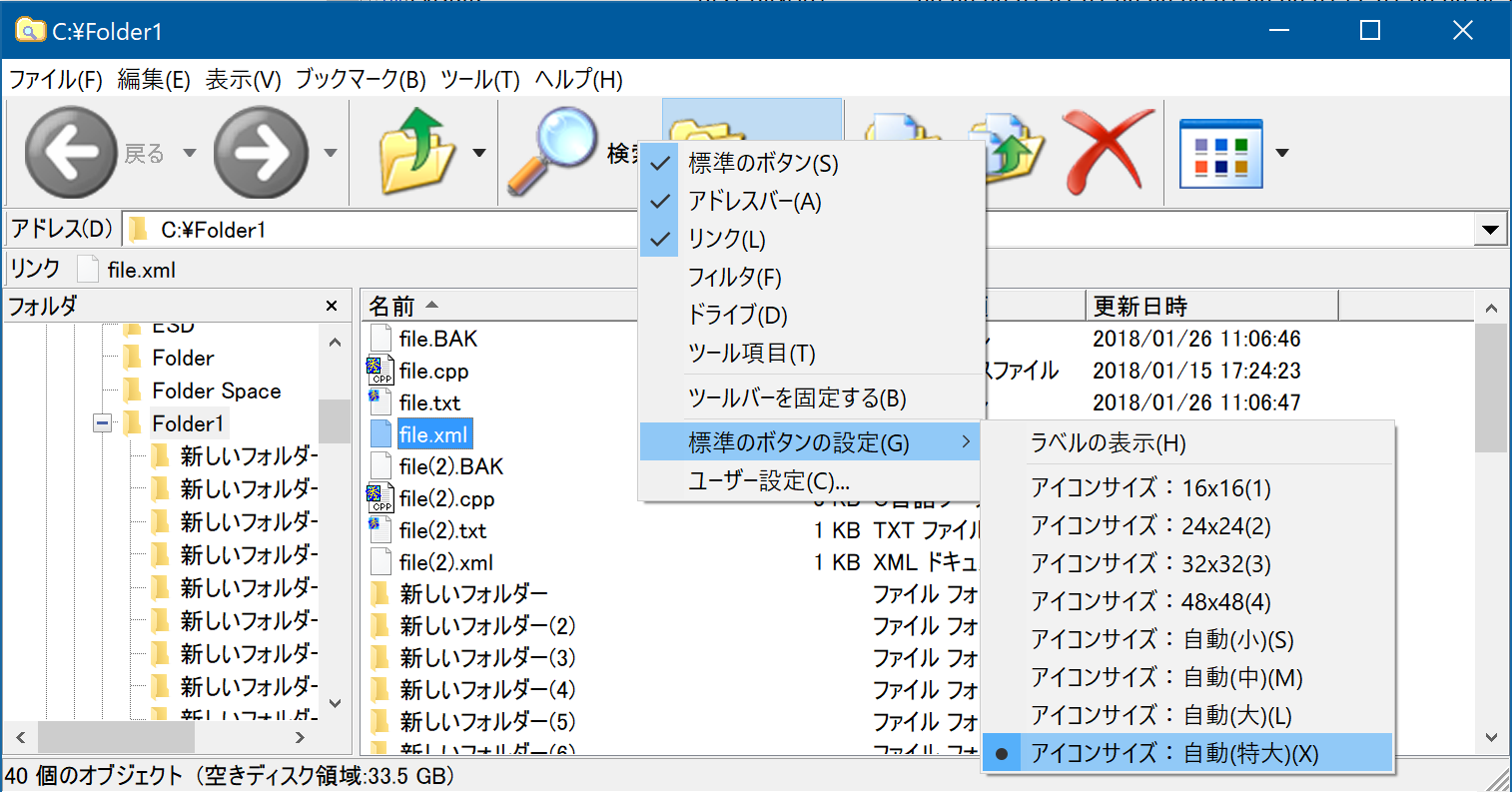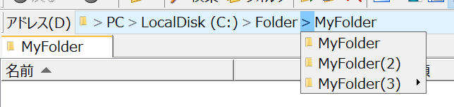 アドレスバーの設定で「パンくずリスト」をONにすると、階層構造をボタンやドロップダウンで操作できます。