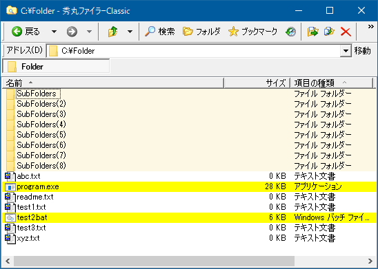 ファイルやフォルダや拡張子など別々の色を付けることができます。
