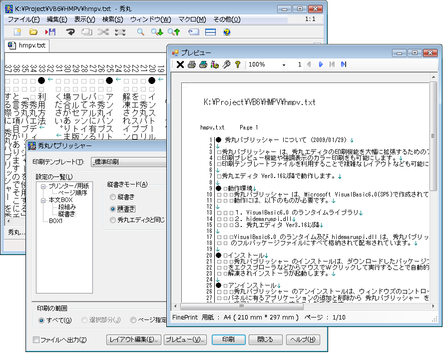 秀丸パブリッシャーのVer4.00から、強制縦書き印刷機能もサポートされました。