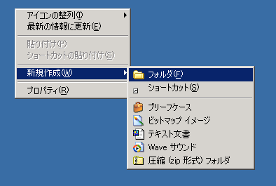 - メールデータをエクスポートする用のフォルダをどこかに作成する。とりあえずデスクトップに「temp」という名前で作成する例だと、まずはデスクトップ上でマウス右ボタンメニューを表示させ、「新規作成 - フォルダ」を実行する。