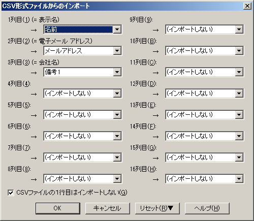 - CSVファイルからインポートする列の指定が出てくるので、1列目=名前、2列目=メールアドレスとし、あとは必要な項目毎に、備考1~備考8のどれかに割り当る。例えば「3列目」の所にエクスポートした時の項目名が、例えば「3列目 (=会社名)」のように出てくるので、それを参考にする。