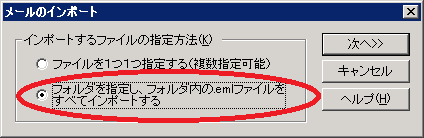 - 「フォルダを指定し、フォルダ内の.emlファイルをすべてインポートする」を選択して「次へ」を押す。