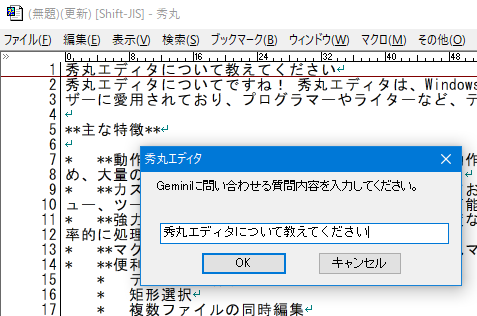 このマクロはAIチャットの「Google Gemini」に問い合わせして結果を秀丸エディタのテキストとして取り込むマクロです。秀丸エディタのVersion 9.40以上とWindows10以上の環境で動作します。